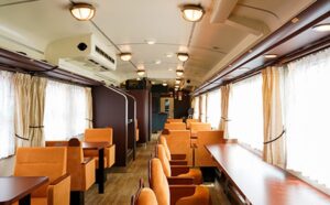 車内はホテルのラウンジのような落ち着いた雰囲気です。木目調の内装や大きな窓が特徴で、瀬戸内海の景色を楽しむために設計されています。