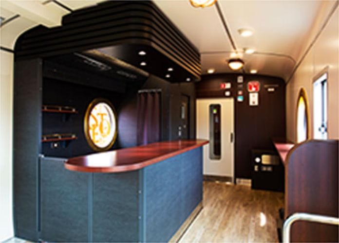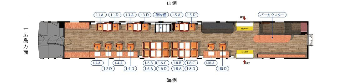 車内はホテルのラウンジのような落ち着いた雰囲気です。木目調の内装や大きな窓が特徴で、瀬戸内海の景色を楽しむために設計されています。